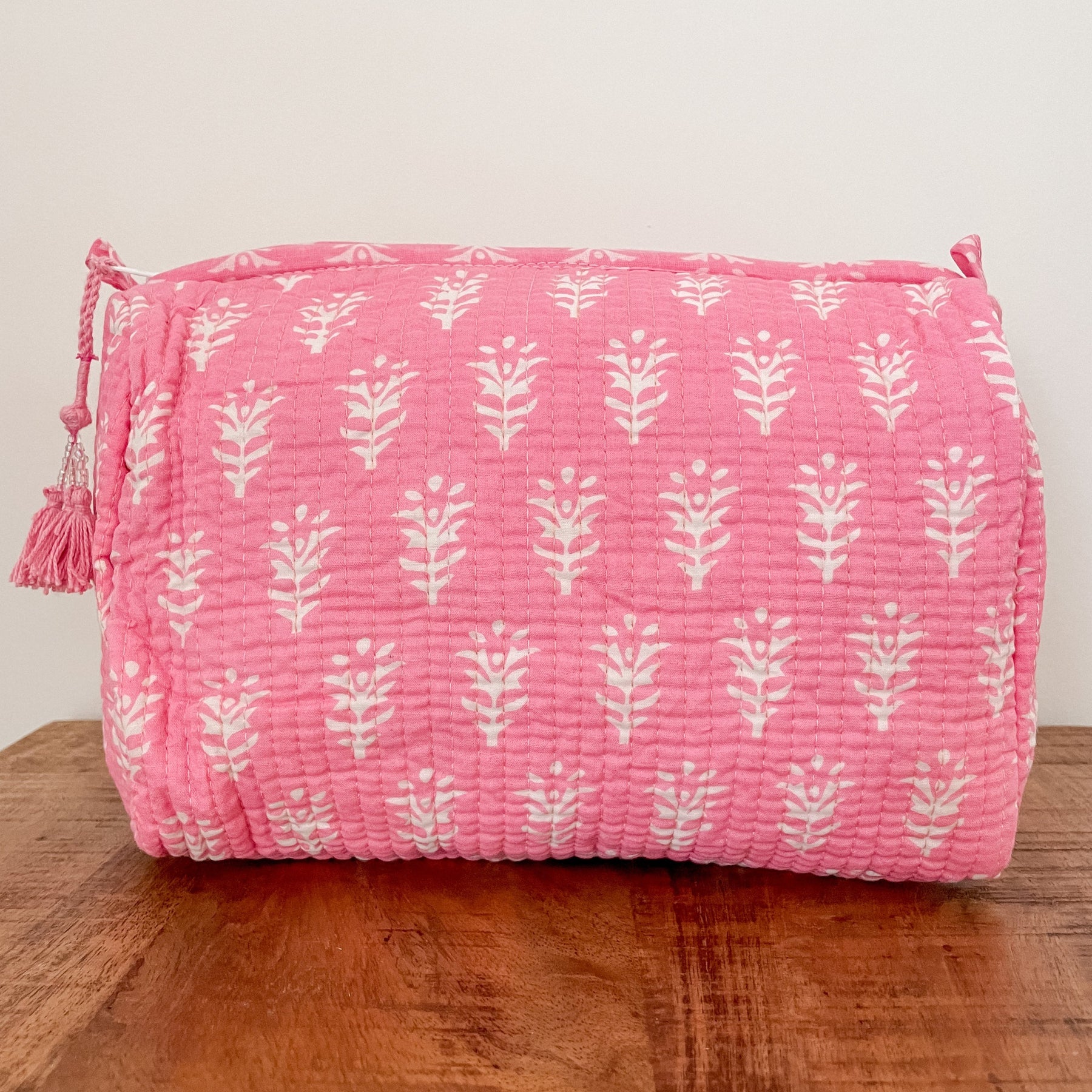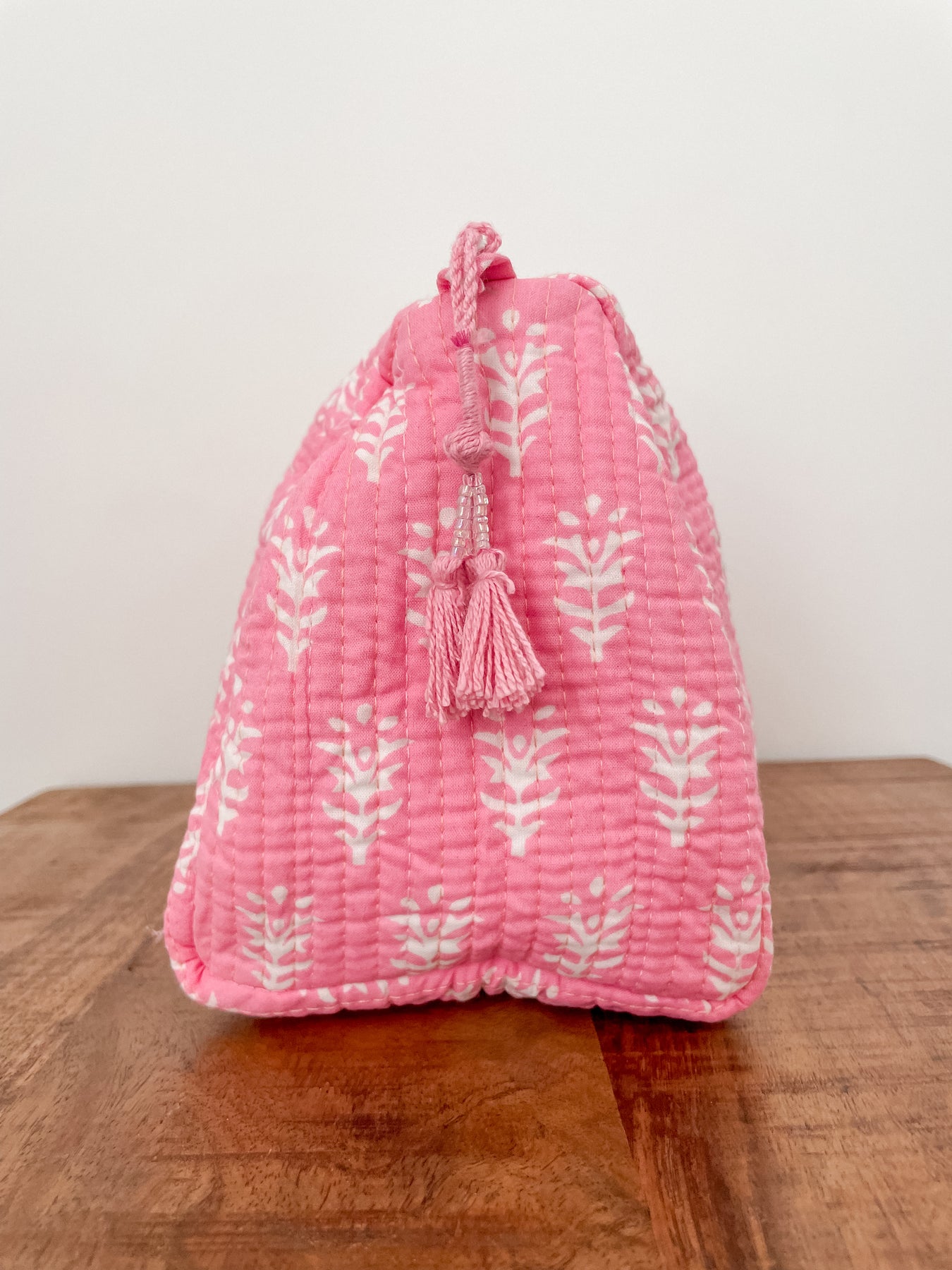 The outer layer is made up of quilted, block printed cotton. Inner layer is lined with water-resistant plastic. Zipper closure with decorative tassel trim.